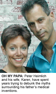 Peter and Karen began to wonder whether there were other family secrets worth looking into as well. At first glance Peter Heimlich is not an obvious choice for sleuthing around in medical archives; his life has included stints as a musician and as a successful businessman. But there may well be no one better prepared to solve the mystery of his father. "I speak Heimlich," he says. "To understand Henry you have to see behind a kind of curtain, because his methods are unconventional and his goals seem to be..." He searches for the right word. "Irrational. I don't think the medical field had ever seen anyone quite like him. The Henry Heimlich story is so improbable and confusing and puzzling and challenging. It's like a Zen puzzle."