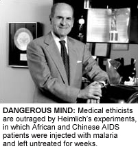 More recently Heimlich has sought to bring malariotherapy to another location where Western medical ethical standards are loosely observed: Africa, where AIDS kills 2 million people each year. Neither Heimlich nor his spokesman Bob Kraft would answer my request for information about Heimlich's studies in Africa. But a number of ancillary characters who have assisted Heimlich's efforts are less guarded, and through them a picture emerges, incomplete but still ghoulish.