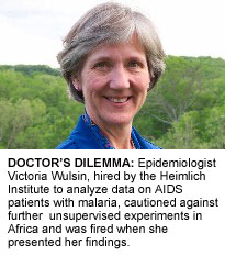 While researching her report Dr. Wulsin, who has field experience with AIDS in Africa, says that Heimlich's assistant, Dr. Eric Spletzer, gave her data that had been gathered from Africa - CD4 counts, apparently from HIV-positive patients who also had malaria - but would not disclose the usual contextual information. There was no signature from the researcher who took the data, and no explanation of how it was gathered. This struck Wulsin as strange; she needed that information to make sure the data wasn't biased. When she asked Spletzer for it, he refused. "I think Eric and Hank [Heimlich] knew things that, for a variety of reasons, they didn't want to share with me," says Wulsin, who declines to say more about what those reasons might be.